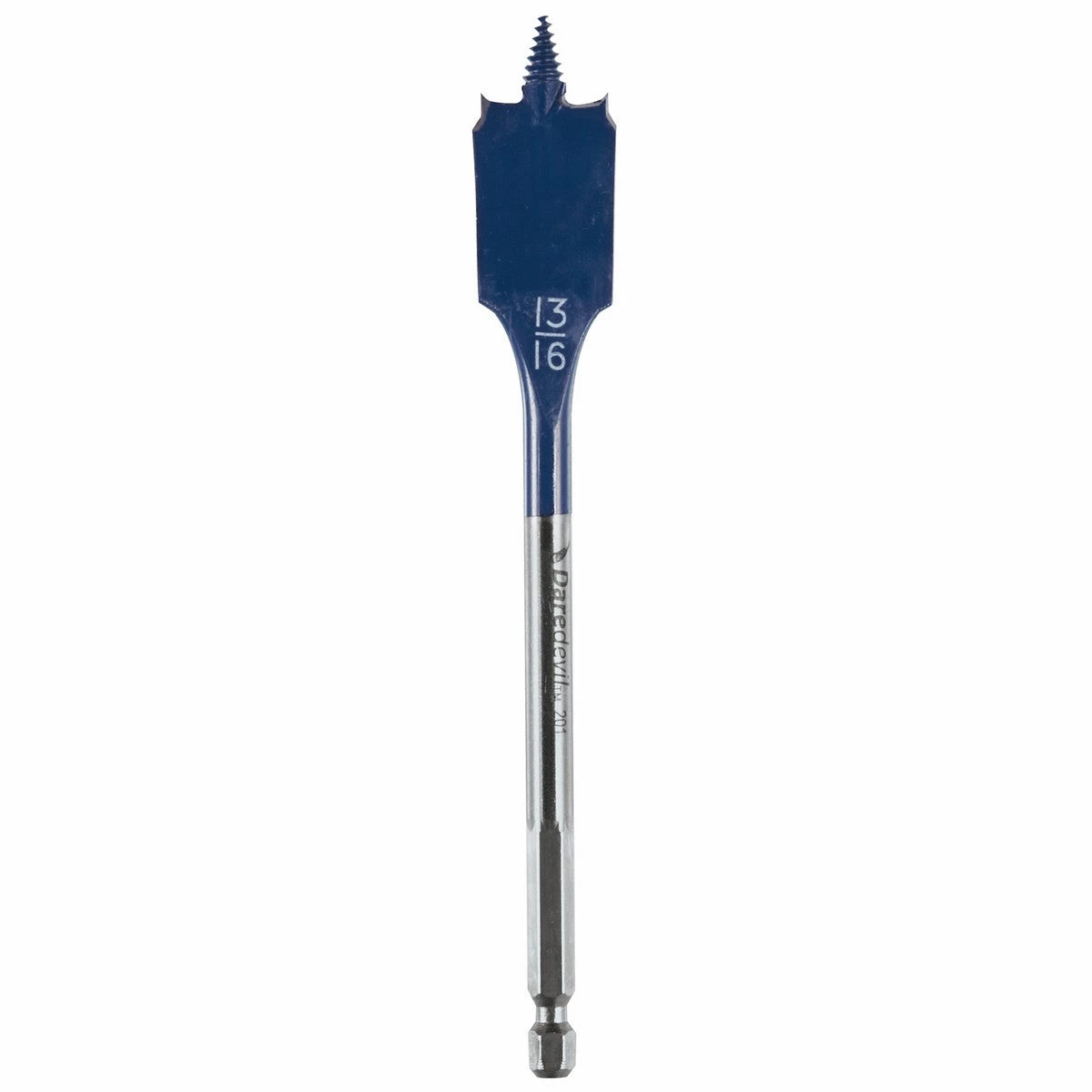 Daredevil™ spade bits are designed for professional users seeking speed, ease of use and hole quality. A full-cone threaded tip pulls the bit through the material with less effort and vibration than other spade bits. The contoured paddle delivers faster chip removal; hex shank with power groove reduces slippage. Up to 10X faster than conventional spade bits.