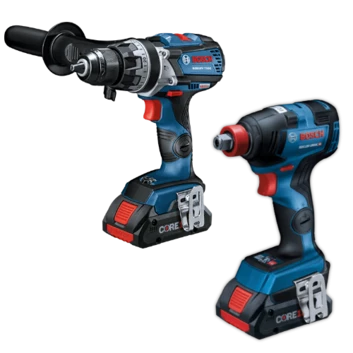 The Bosch 2-Tool Combo Kit with two CORE18V batteries combines drilling and driving versatility with next-gen Li-ion 21700 cell technology. The GXL18V-224B25 kit features two CORE18V batteries that provide next-gen Li-ion 21700 cell technology in lightweight, high-power batteries with all-day performance. The GDX18V-1800C Freak 1/4 In. and 1/2 In. Impact Driver delivers results, with the two-in-one bit/socket drive that offers a 1/4 In. quick-change hex shank holder for bits, and a 1/2 In. square drive for sockets. Producing up to 1,800 In.-Lbs. of torque, the Freak features a head length of 5.8 In., to accomplish any drilling or driving application. The GSB18V-755C Brute Tough 1/2 In. Hammer Drill/Driver has KickBack Control technology, up to 755 In.-Lbs. of torque and 0-31,500 beats per minute (bpm), at only 3.5 Lbs. (tool only, not including battery). Both tools feature Bluetooth® connectivity to an optional Connected Tool Module and EC Brushless motors.