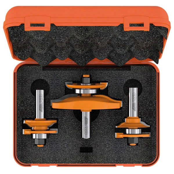 CMT’s junior raised panel sets add intricate detail on a whole new scale! You will make frame and panel details as small as 70mm (1-3/4″) square in material as thin as 11mm (7/16″). Delicate panel doors are only the beginning – use these bits with templates to add interesting arches to your work. The sets include a choice of a cove or an ogee raised panel bit and an ogee rail & stile pair. Packaged in beautiful case.