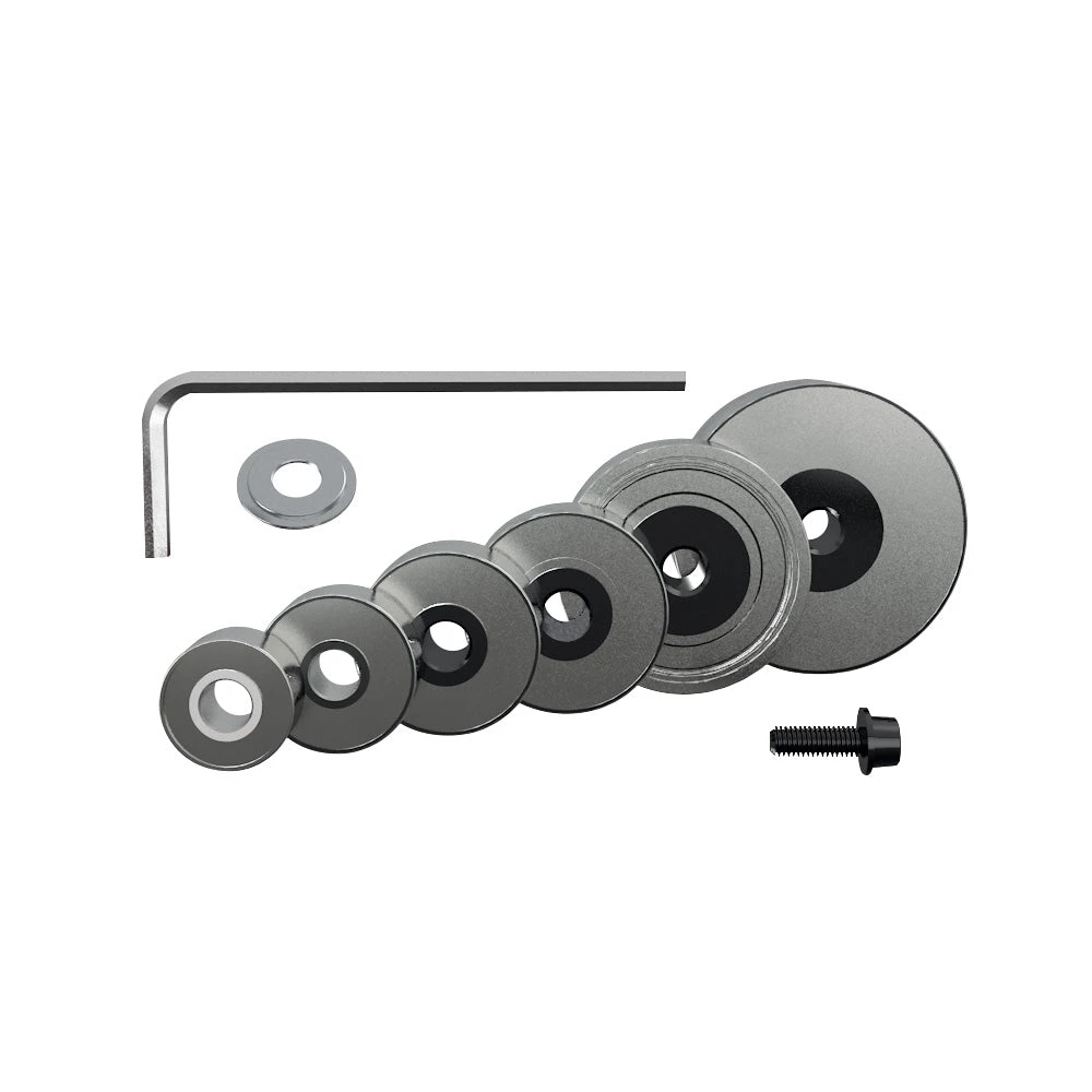 CMT rabbeting sets include one rabbeting bit, 6 interchangeable ball bearing guides, fastening screws, shields and an Allen Key. In order to change cutting depth, substitute the bearing.