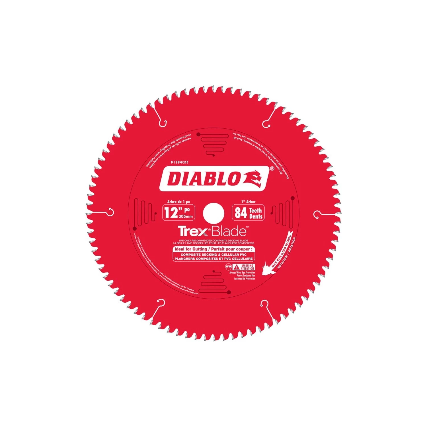 The Freud Diablo D1284CDC 12 in. x 84-Tooth Trex Blade is the only recommended composite decking by Trex Company when cutting composite decking materials. The blade delivers maximum performance and highest quality of finish; making it a must-have tool for both professionals and DIYers planning composite decking projects. Diablos new saw blade series has a modified triple chip tooth grind design; Perma-SHIELD non-stick coating; and specific TiCo Hi-Density carbide to deliver more efficient and cleaner cuts with no swirl marks; less gumming of blade teeth and longer cutting life.