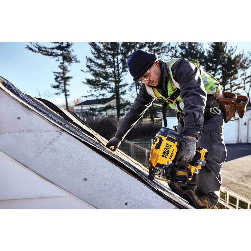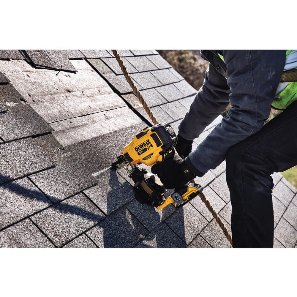 Ideal for service repairs and small jobs, this Dewalt DCN45RND1 20V MAX* 15° Cordless Coil Roofing Nailer delivers cordless convenience. There are absolutely no hoses, compressors, or gas cartridges required. It’s 100% battery-powered so the pro can show up and get to work right away. The 20V MAX* 15° Cordless Coil Roofing Nailer can drive the full range of roofing fasteners from 3/4 in. to 1-3/4 in. Get the job done quickly and efficiently with bump actuation mode and tool-free depth adjustment that provides precise nail placement.