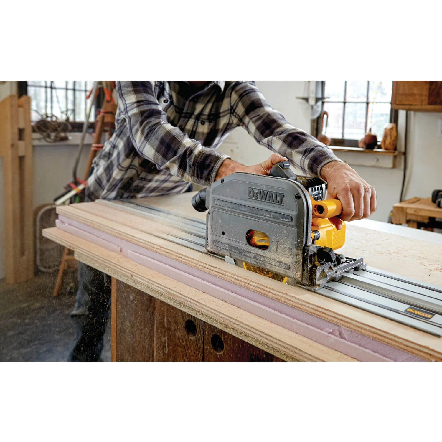 The DCS520T1 60V MAX* 6-1/2″ TrackSaw™ Kit has a brushless motor to easily power through hardwoods up to 2-1/8″ thick. Features straight plunge mechanism for optimal ergonomics. For use with TrackSaw™ cutting system to deliver precise, straight, splinter-free cuts.