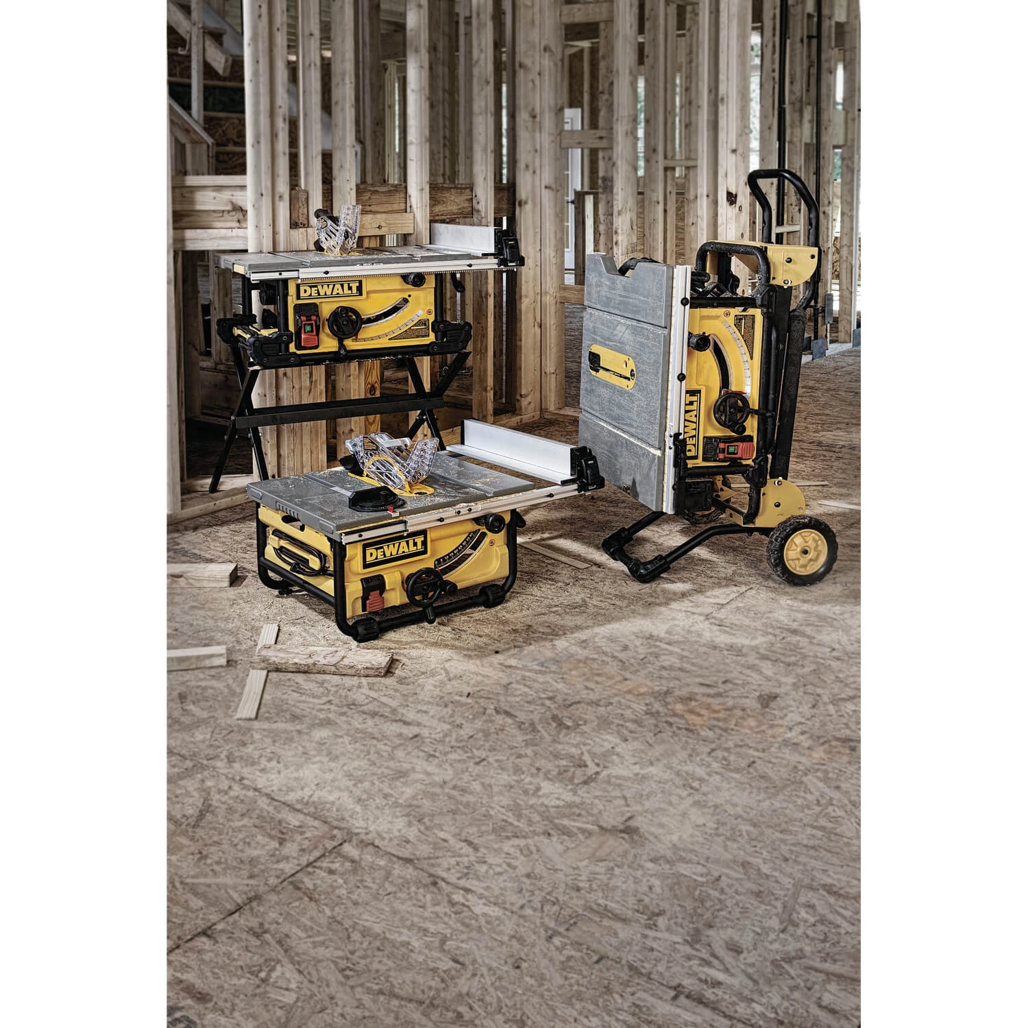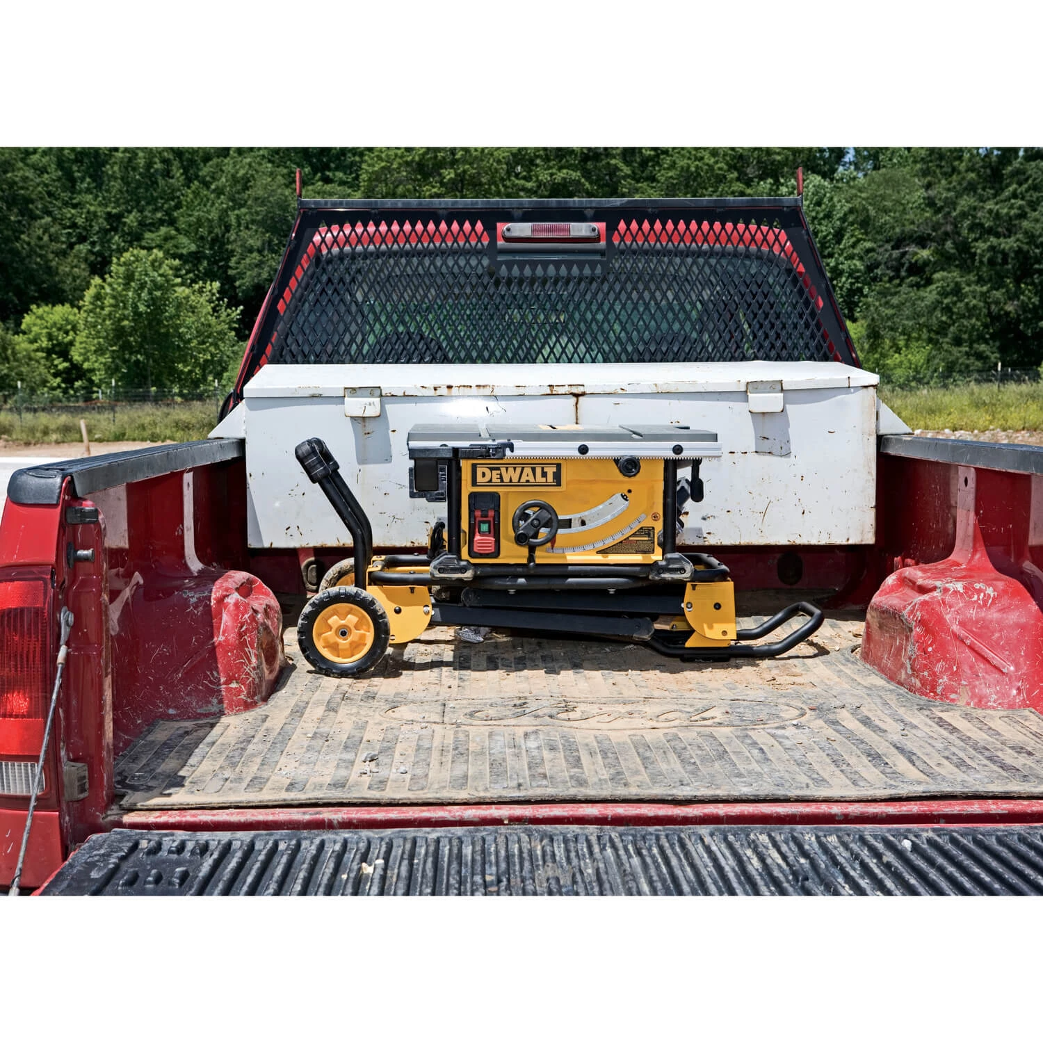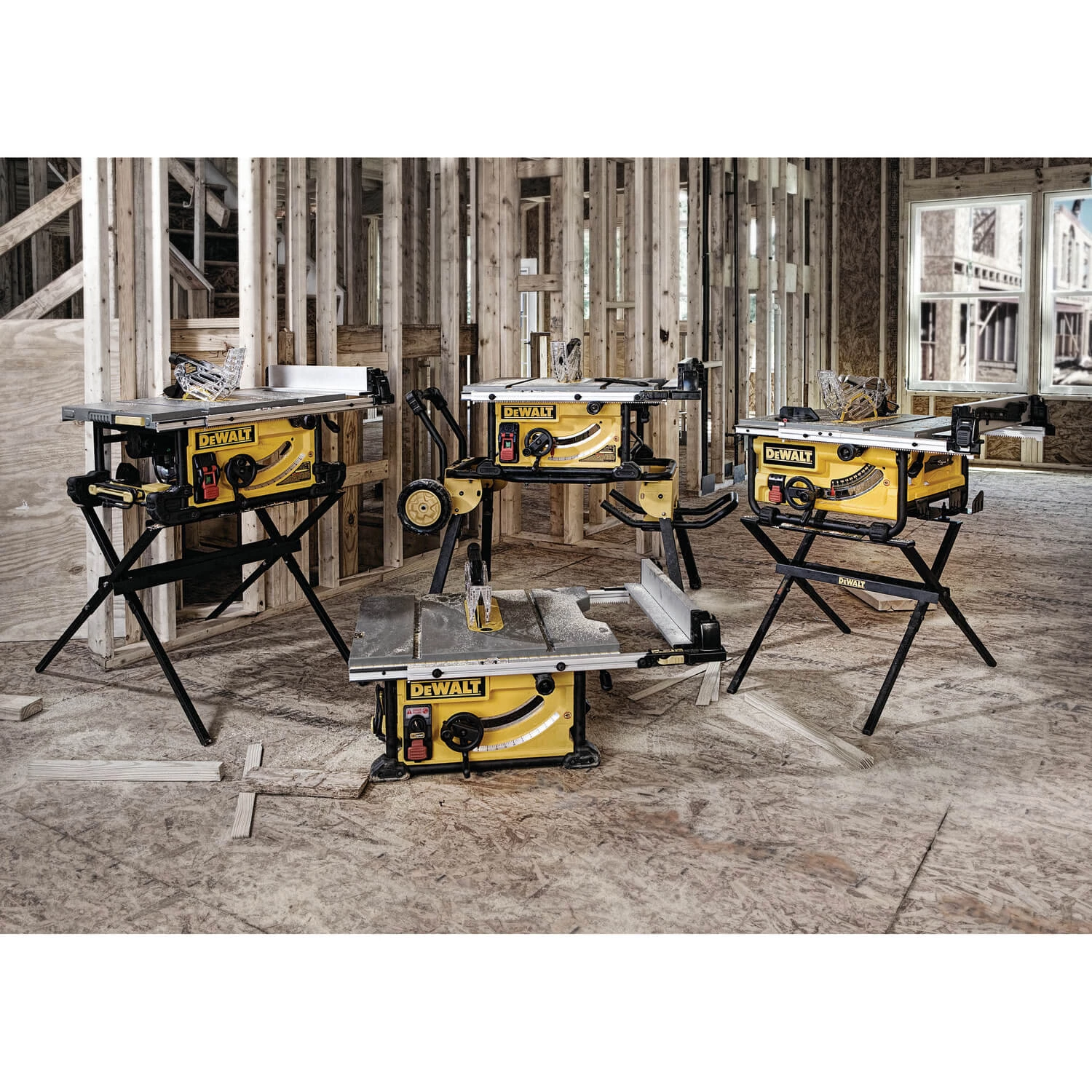 The DWE7491RS 10″ Jobsite Table Saw 32 – 1/2″ Rip Capacity, and a Rolling Stand has a 15 Amp motor and 32-1/2″ rip capacity to allow cutting of large and hardwood materials. Features tool-free guarding component adjustments and fast, accurate fence adjustments. Rolling stand designed for easy set up and breakdown with excellent stability.
