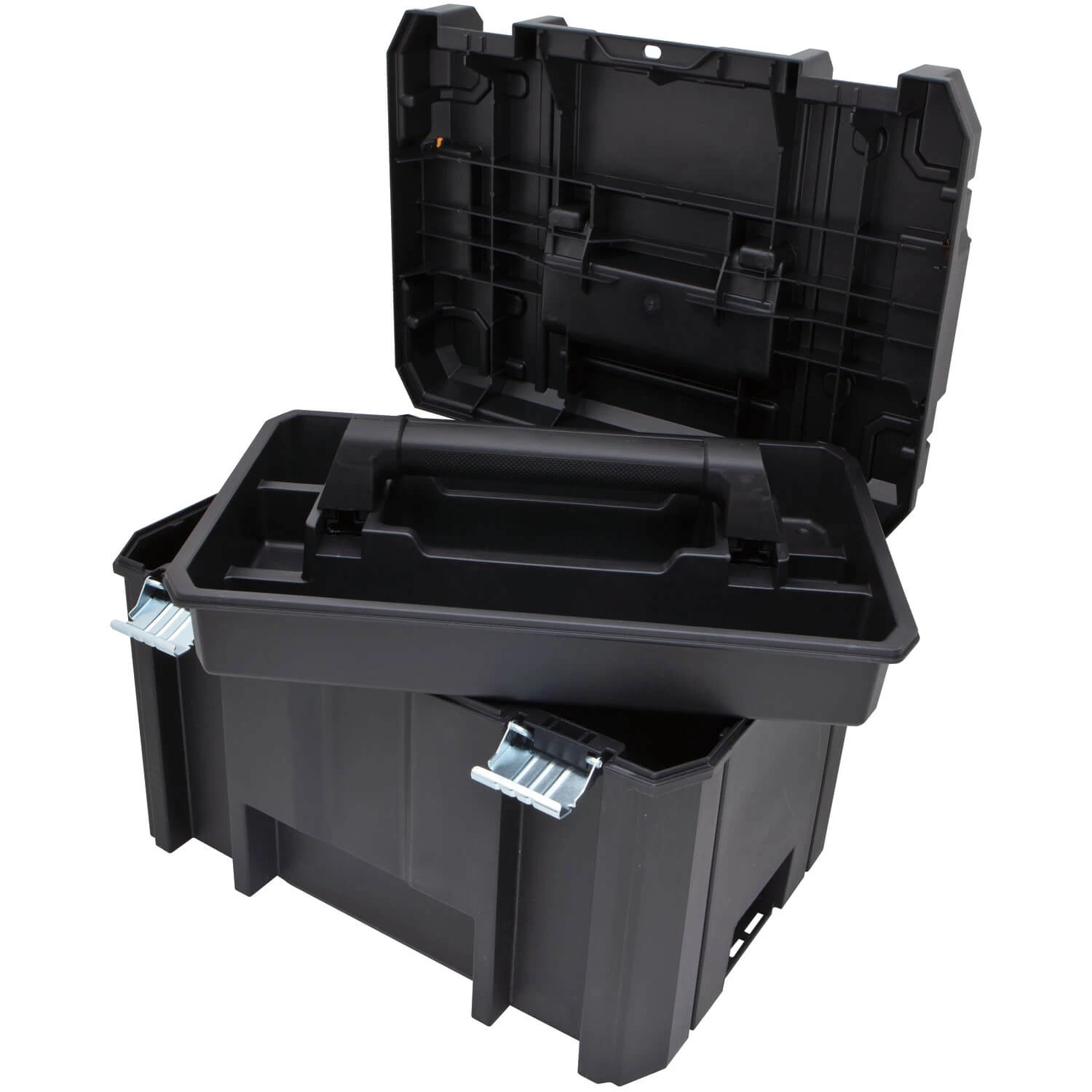 The TSTAK® deep box with flat top offers new innovation in storage options. This flexible platform allows different combinations; all units can stack on top of each other and able to connect with durable side latches for easy carrying and safe stacking. This unit can be used for storage of corded and cordless tools and features a removable tray for access to essential tools. Heavy duty metal latches and hinges are built for durability.