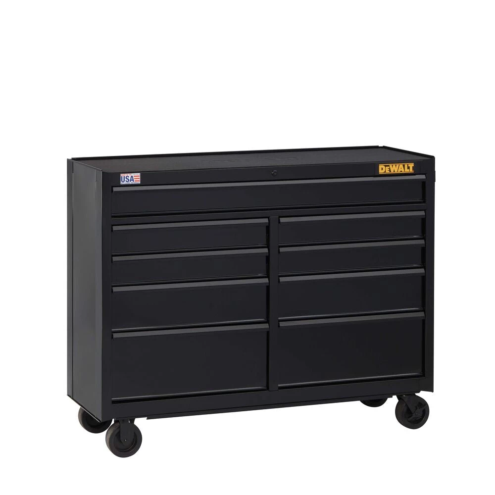 This 52-inch wide 9-Drawer Rolling Tool Cabinet is constructed of double-wall steel for strength and durability. It has nine 100-pound load capacity drawers with soft close latching for smooth and quiet operation. Conveniently charge your power tools, batteries, and electronics from the side of the cabinet. It also has a heavy-duty keyed internal locking system to safeguard tools. The cabinet has a load rating of 1,500 pounds with reinforced mounting channels, and four 5-inch x 2-inch casters, two of which lock and swivel. A full-grip tubular side handle with a comfortable black overmold is included for ease of mobility. Also included are nine DEWALT embossed drawer liners and one DEWALT embossed top mat to help protect the cabinet surface. Recommended with this unit is our 700 Series 52-inch wide 8-Drawer Tool Chest (DWST25181), sold separately. Look no further than our Metal Tool Storage line for your tool storage and organization needs. Choose from a variety of sizes in top tool chests and rolling tool cabinets, all of which are made of 18-20 gauge steel. All units have an 18-inch depth to fit our mechanic tools sets, and other hand tools and accessories.