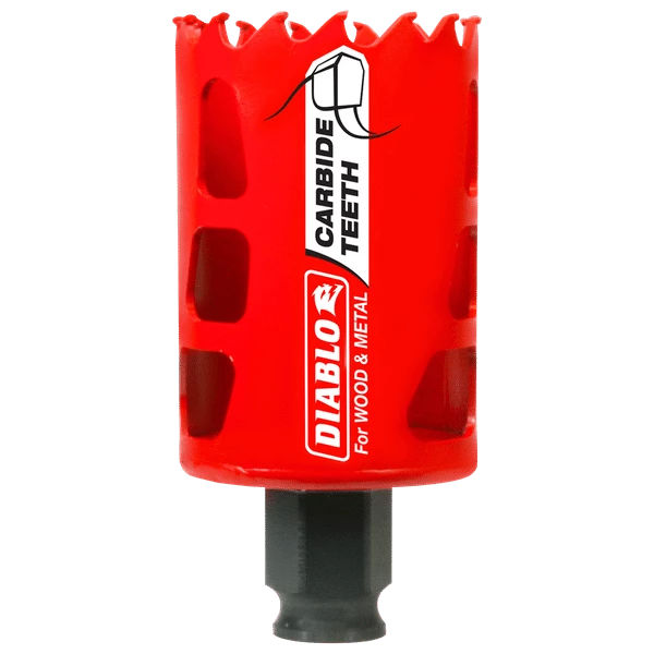 Diablo introduces the first carbide-tipped hole saws on the market to cut both wood and metal (wood, nail-embedded wood, plastic, aluminum, metal, cast iron, stainless steel and metal). Delivering 50 times longer cutting life than bi-metal, these new carbide-tipped hole saws offer faster cutting performance and increased productivity.