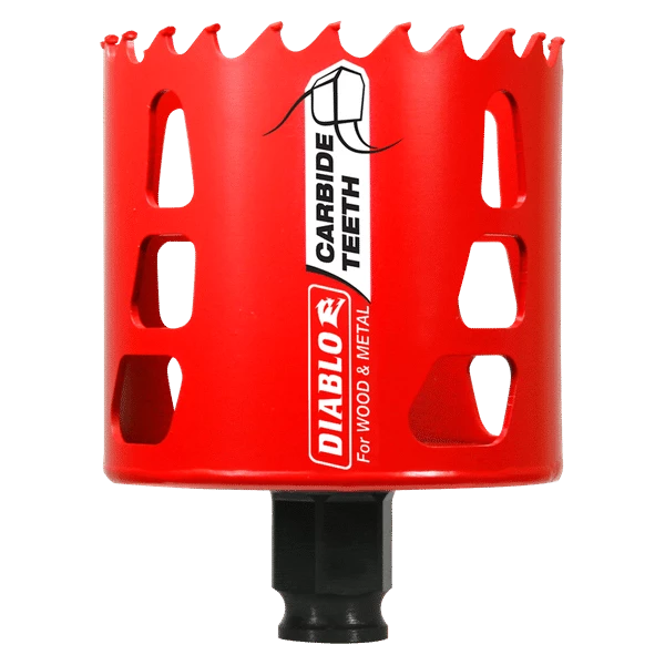 Diablo introduces the first carbide-tipped hole saws on the market to cut both wood and metal (wood, nail-embedded wood, plastic, aluminum, metal, cast iron, stainless steel and metal). Delivering 50 times longer cutting life than bi-metal, these new carbide-tipped hole saws offer faster cutting performance and increased productivity.