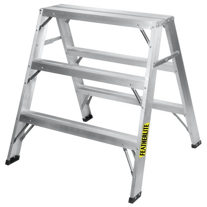 This Featherlite 3 foot aluminum sawhorse has a 300lb load capacity. This sawhorse combines two essential tools to create a lightweight wide surface and a support tool for sawing and other tasks. This sawhorse is equipped with angled aluminum slip-resistant rubber feet, heavy gauge steel hinges, heavy duty gusset bracing, and double-rivet step construction.