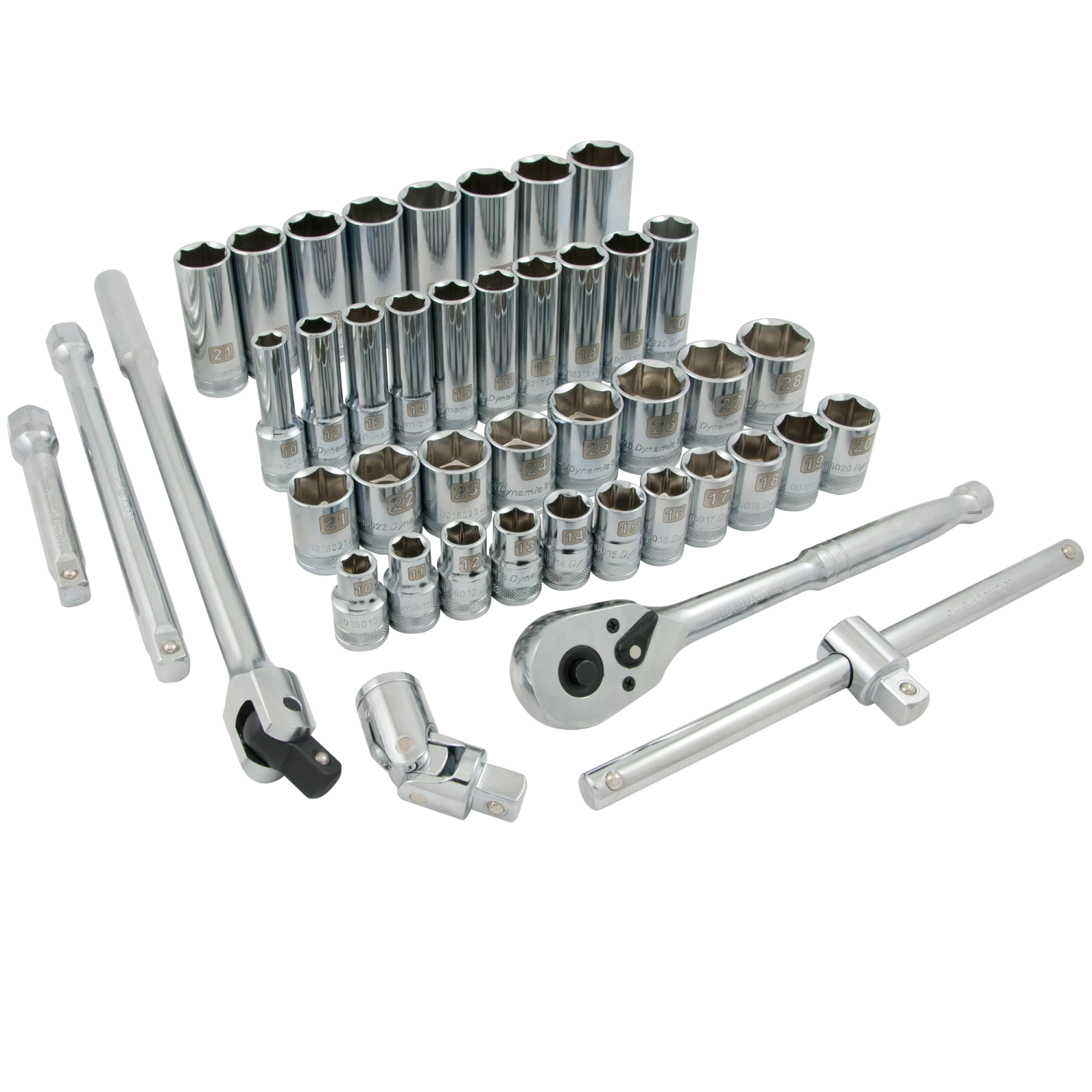 - Contains: 19 Standard Metric Sockets: 10, 11, 12, 13, 14, 15, 16, 17, 18, 19, 20, 21, 22, 23, 24, 25, 26, 27, 28mm, 18 Deep Metric Sockets: 10, 12, 13, 14, 15, 16, 17, 18, 19, 20, 21, 22, 23, 24, 25, 26, 27, 28mm, 5 & 10 Extensions, 45 Tooth Ratchet, Universal Joint, Flex Handle, T-handle, Drive Type: 6 Point