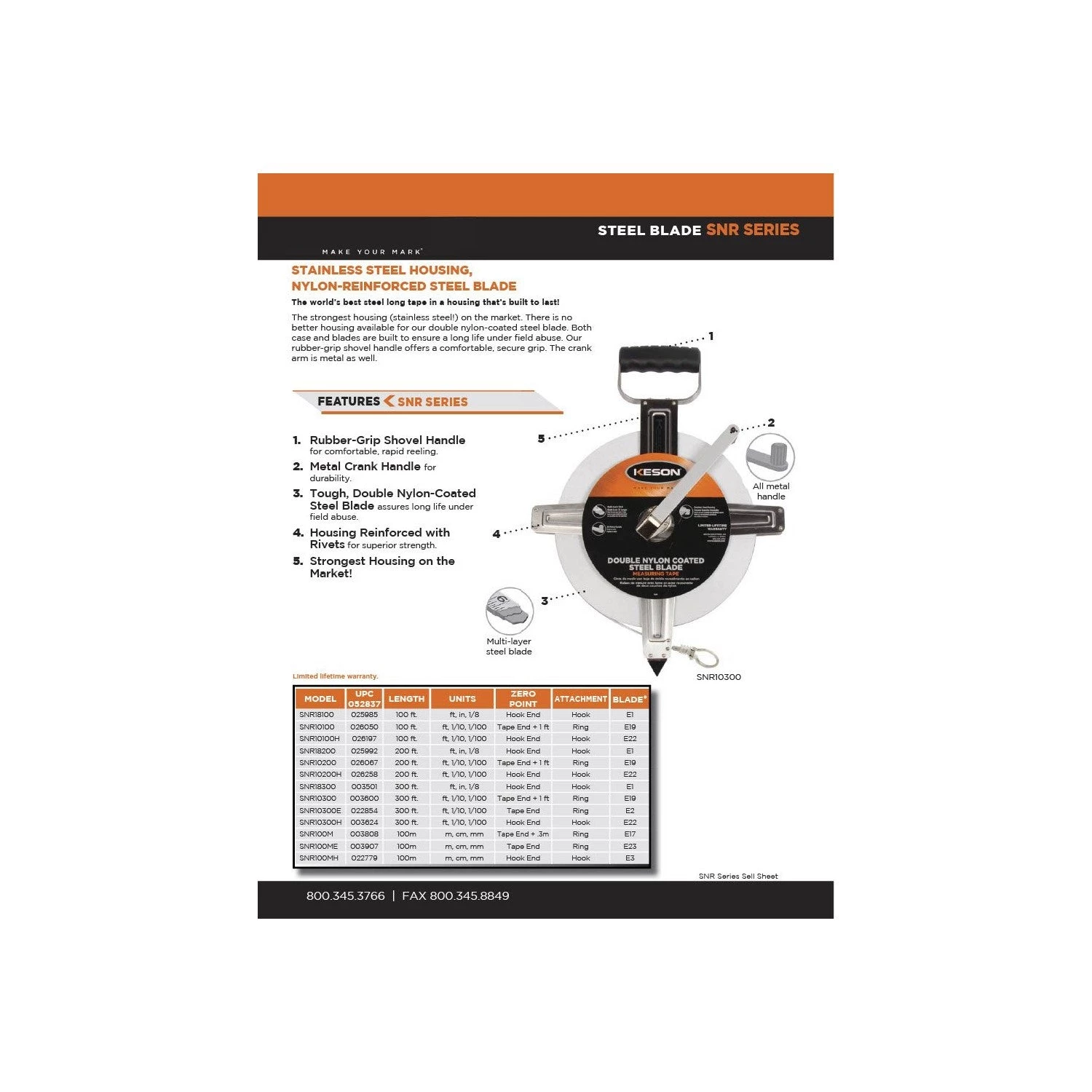 The world’s best steel long tape in a housing that’s built to last. Features the strongest housing (stainless steel) on the market. Tough, double nylon-coated steel blade assures long life under field abuse. Rubbergrip shovel handle for comfortable, rapid reeling. Metal crank handle for durability. Housing is reinforced with rivets for superior strength.