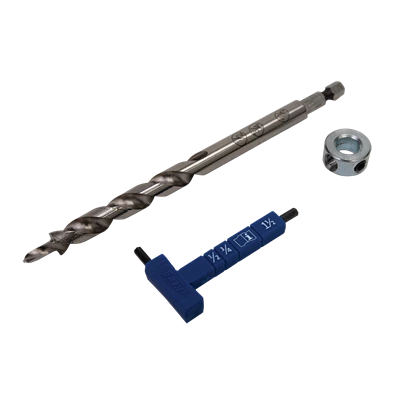- Stepped drill bit, stop collar, and thickness gauge/wrench for Kreg® Pocket-Hole Jigs