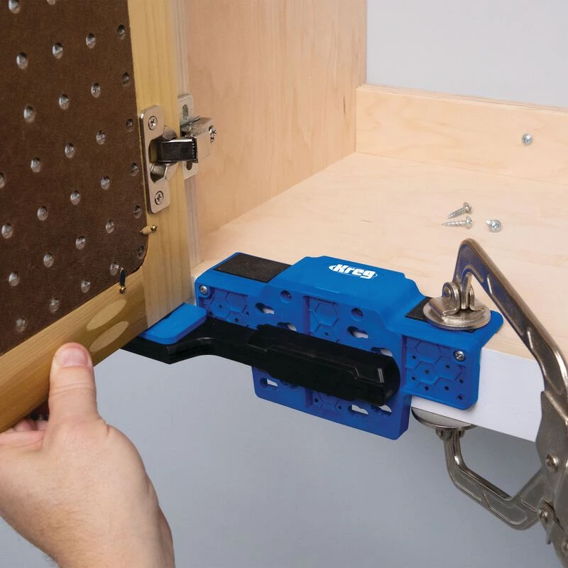 Get an extra helping hand for installing cabinet doors with the Kreg Cabinet Door Mounting Jig. It makes the job of installing cabinet doors a breeze – whether you’re working with face frames or frameless cabinets. It works with both left-hand and right-hand doors.