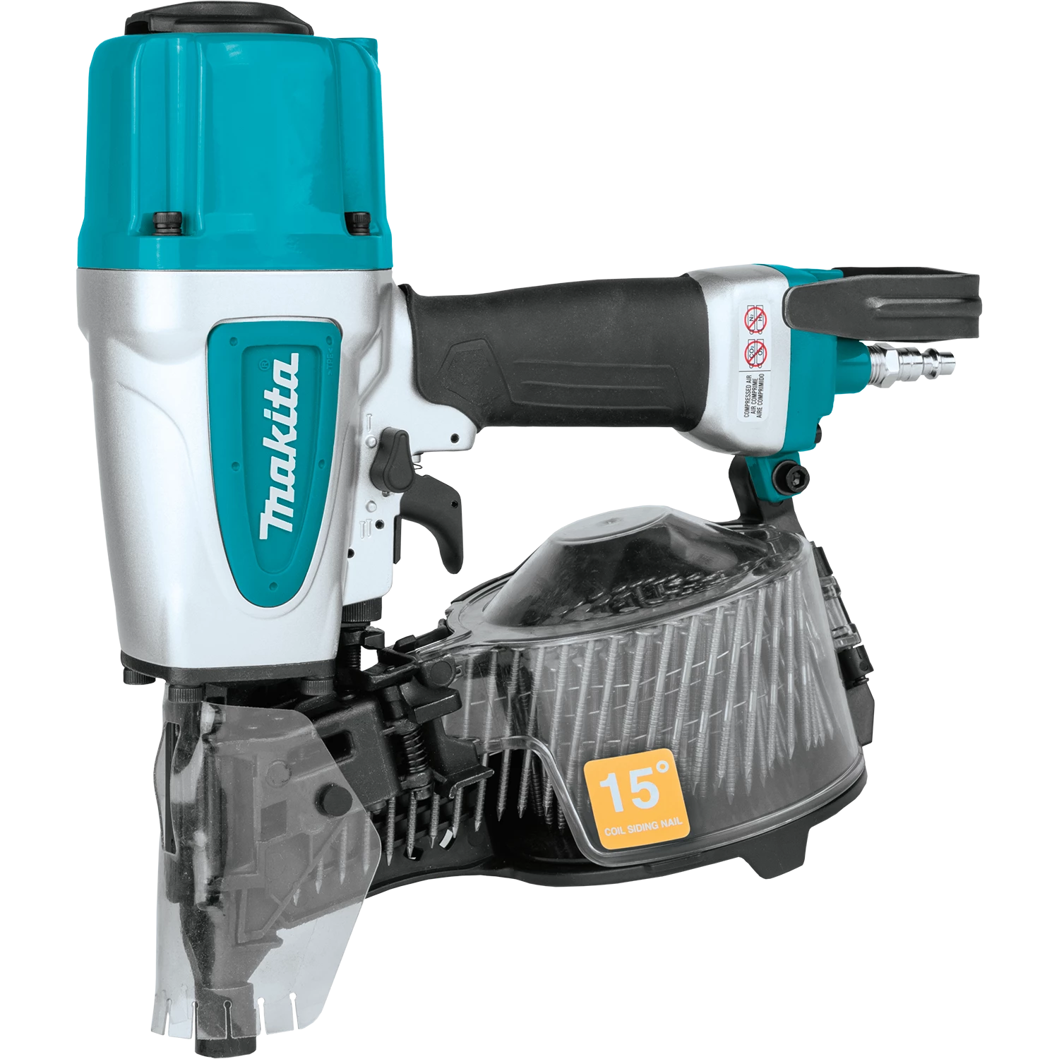 The Makita® 2-1/2″ Siding Coil Nailer (AN613) offers rugged construction and robust performance. The AN613 drives 15º wire and plastic collated nails for added convenience. The AN613 is engineered for longer tool life with durable and lightweight aluminum housing and an easy-loading adjustable canister. Ease-of-use features include a “tool-less” depth adjustment with nine detents settings engineered for more precise control and flush nailing. Additional features include rubber bumpers to protect the tool, smooth nose tip to prevent scratching, a multi-directional exhaust port, and reversable belt hook.