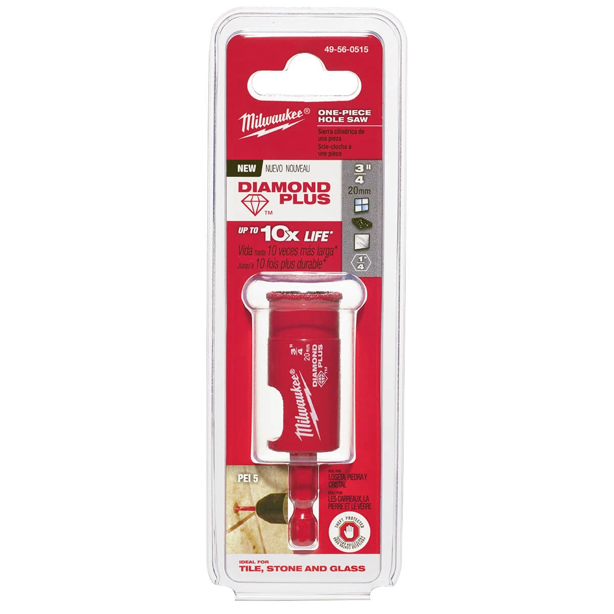 Choose the Milwaukee® Diamond Plus™ Hole Saw for up to 10X longer life when cutting tile, stone and glass. Diamond Plus™ Hole Saws deliver best-in-class performance, with higher grade diamonds for maximum heat and fracture resistance. An improved braze provides superior diamond retention when cutting hard, abrasive materials. The One-Piece Hole Saw has a 1/4″ quick change hex shank and features a large slug ejection slot. Designed as the single cutting solution for all tile, stone, and glass applications, Diamond Plus™ offers the lowest cost-per-hole on the market.