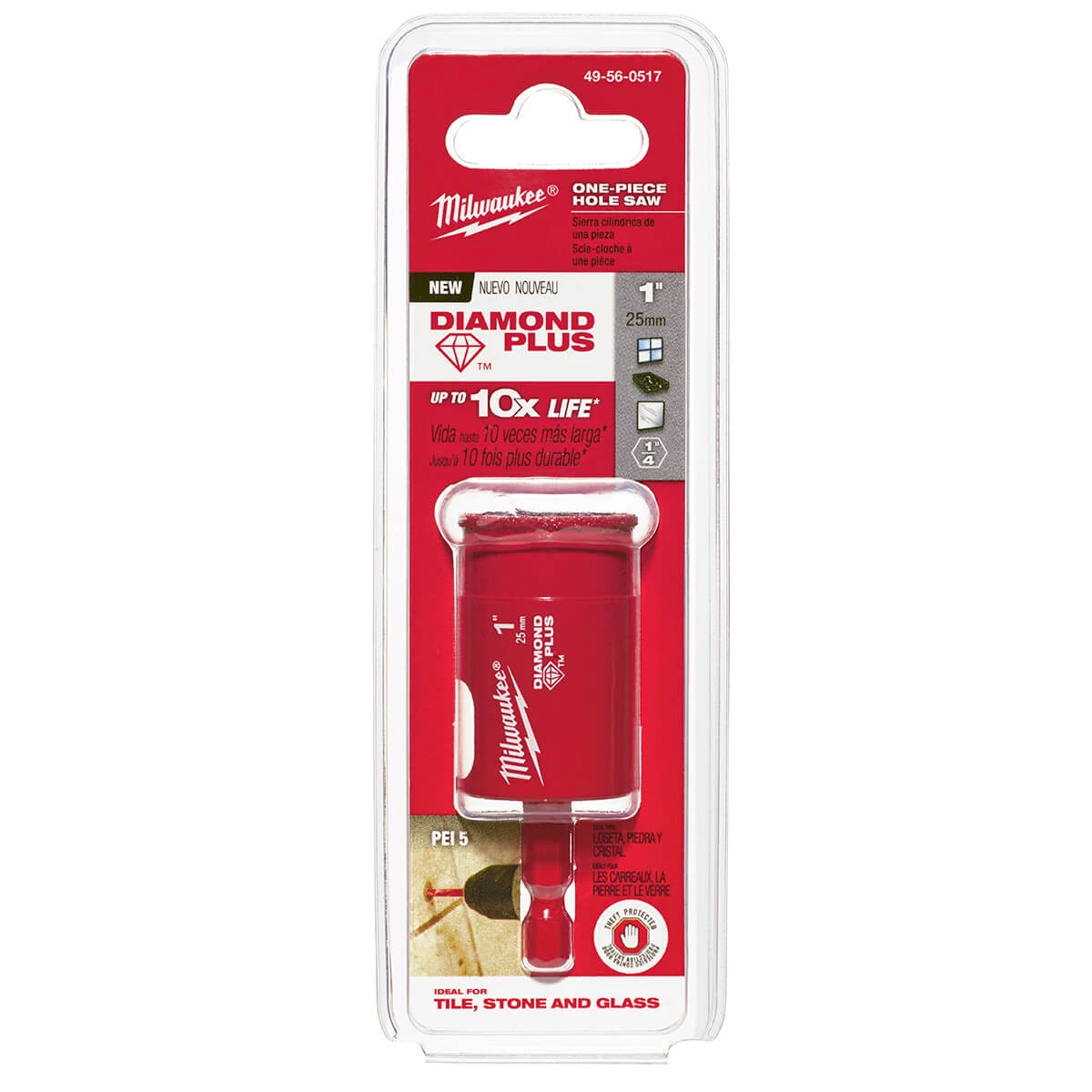 Choose the Milwaukee® Diamond Plus™ Hole Saw for up to 10X longer life when cutting tile, stone and glass. Diamond Plus™ Hole Saws deliver best-in-class performance, with higher grade diamonds for maximum heat and fracture resistance. An improved braze provides superior diamond retention when cutting hard, abrasive materials. The One-Piece Hole Saw has a 1/4″ quick change hex shank and features a large slug ejection slot. Designed as the single cutting solution for all tile, stone, and glass applications, Diamond Plus™ offers the lowest cost-per-hole on the market.
