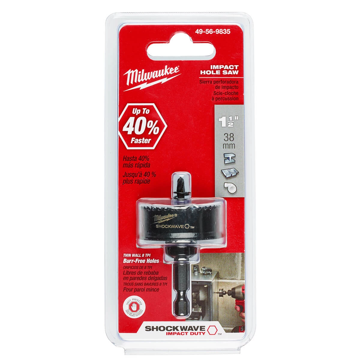 Designed with a robust ¼” quick change hex shank, Milwaukee® Shockwave Impact Duty™ Thin Wall Hole Saws give professionals a hole making solution to use with impact drivers. Utilizing a thin wall, 8 TPI design, Thin Wall Hole Saws deliver a burr-free cut up to 40% faster than standard bi-metal hole saws. The included ejection spring removes the frustration of manually removing slugs by automatically ejecting the material. A stop shoulder design prevents over-drilling into material and potentially damaging inner components of electrical and junction boxes. Choose Thin Wall Hole Saws for use in plastics and thin gauge metals up to 1/8” thick.