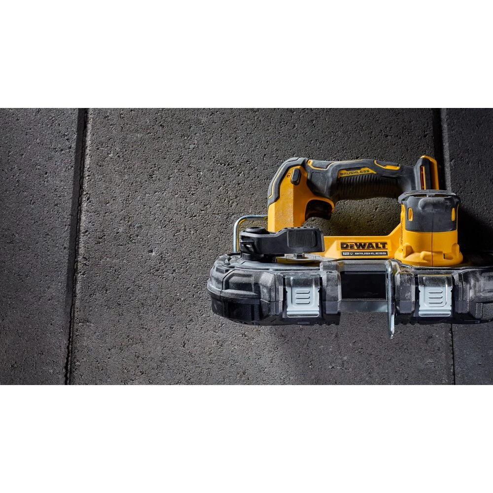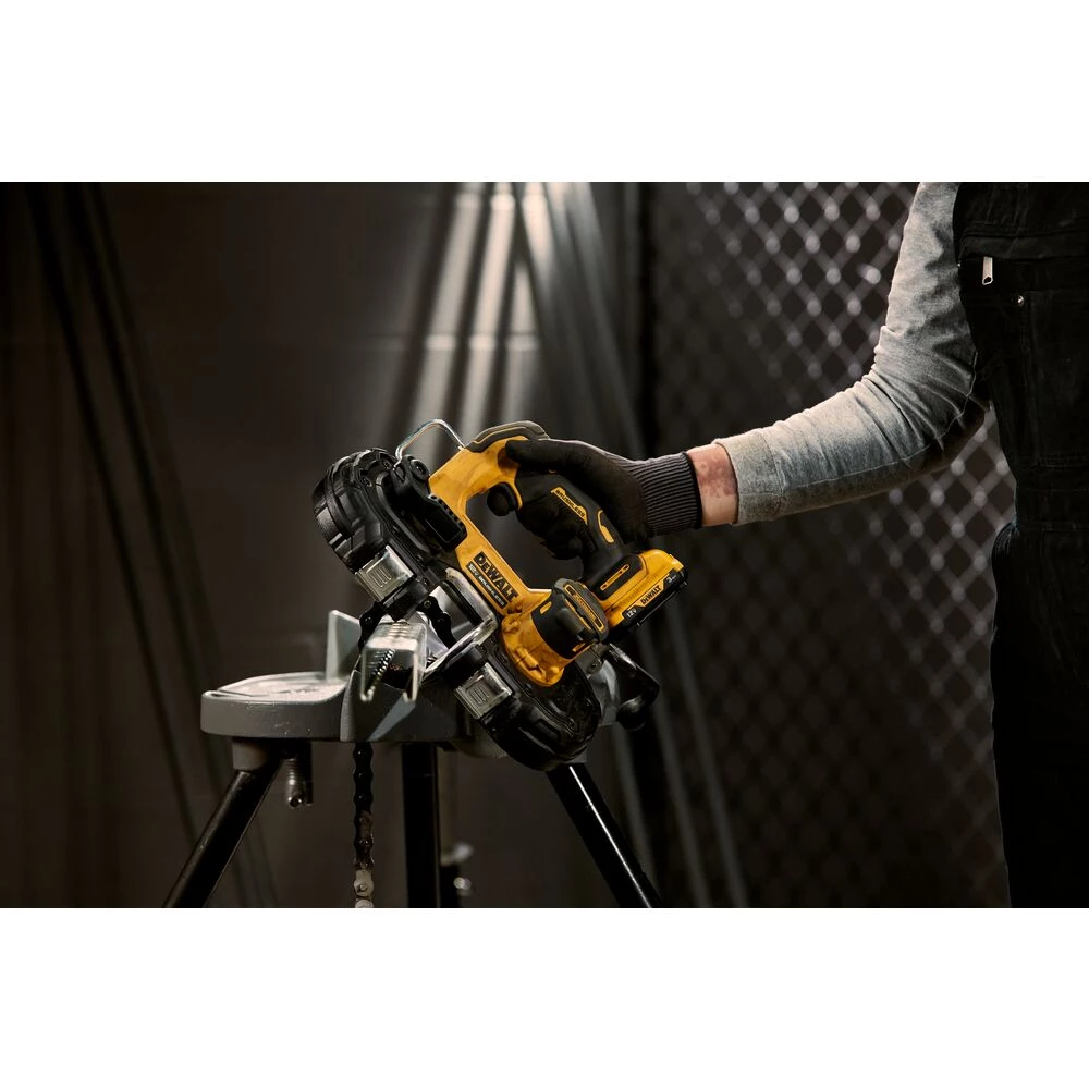 The compact XTREME 12V MAX* 1-3/4 in. Brushless Cordless Bandsaw is lightweight at 6.54 lbs. with an integrated guard making it ideal for overhead and one-handed cutting jobs. The 1-3/4 in. cut capacity allows for cuts through small metal diameters with additional room to cut 1-5/8 in. comfortably. The variable-speed trigger helps provide control when cutting through hard materials. For added ease of use, simply hang this bandsaw when you’re ready to switch tasks with the integrated hook and illuminate dark workspaces with bright onboard LED.