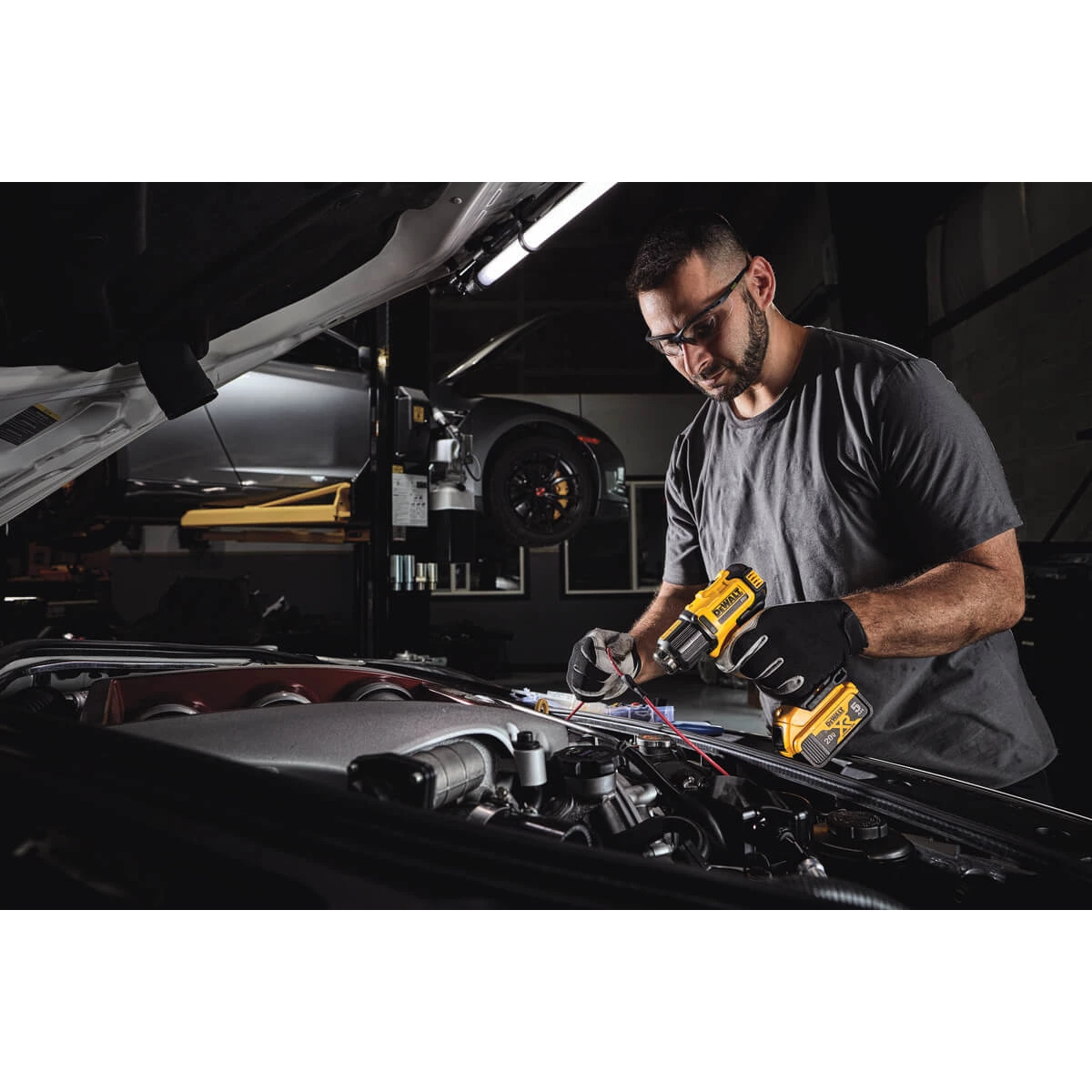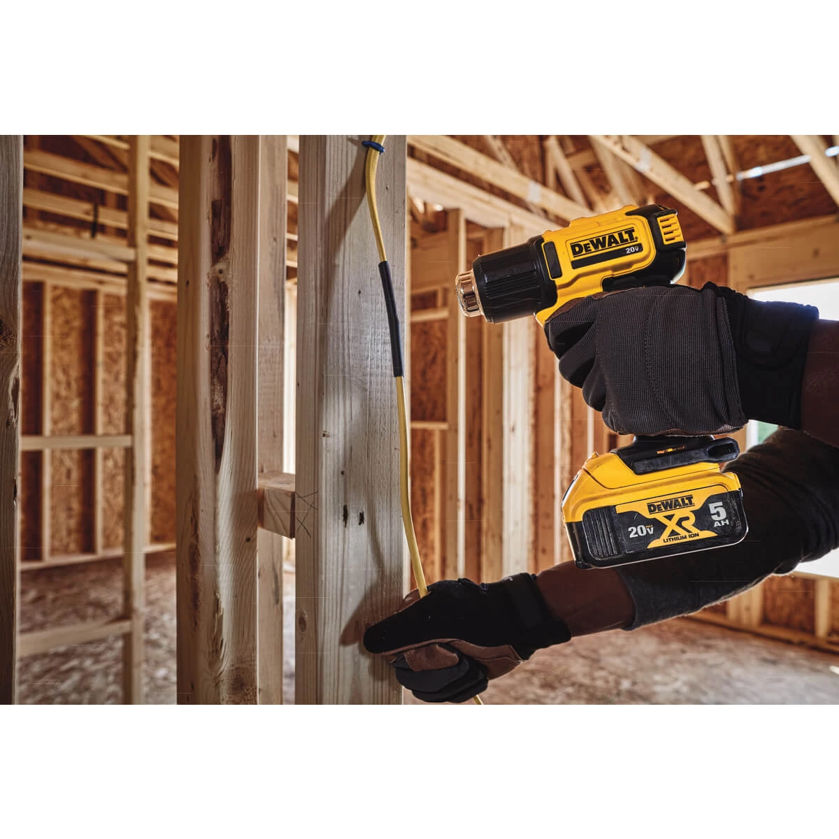 The DCE530B 20V MAX* cordless heat gun can take you places your corded heat gun can’t. The cordless heat gun’s compact design allows for use in tight spaces and diverse applications. From heat shrinking wire tubing to paint and decal removal, this cordless heat gun gets the job done. It features up to a 990°F max output temperature** and comes with two temperature settings. The specialty lock on and off feature allows for hands free operation as needed. The nozzle is the standard size of traditional heat guns, allowing attachments from corded units and other brands to fit with ease. This cordless heat gun includes a flat nozzle and hook nozzle attachment. Battery and charger sold separately.