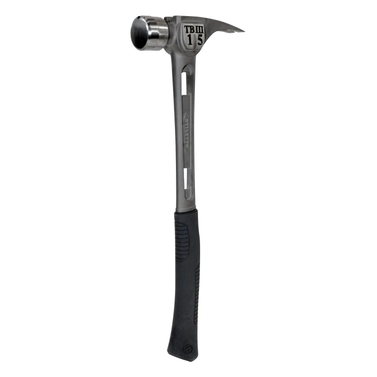 The STILETTO® 15oz. Ti-BoneIII Smooth Face Hammer with an 18in. Curved Handle is powerful, painless & lightweight. The Hammer has a 180° side nail puller that eases 16p nails out in one motion, along with and Stiletto’s signature magnetic nail starter. The TiBoneIII drives like a 28 oz. Steel hammer and is recommended for Pole barn, Concrete, Framing and Remodeling. The newly designed anti-rotational face, which prevents the face from coming loose during use. The durable grip will not peel or crack. Titanium is 45% lighter weight while providing the same striking force and strength as steel. Titanium tools also produce 10 times less recoil shock which helps reduce carpal tunnel syndrome. The combination of these features means less downtime, more productivity, and most importantly, less pain while working.