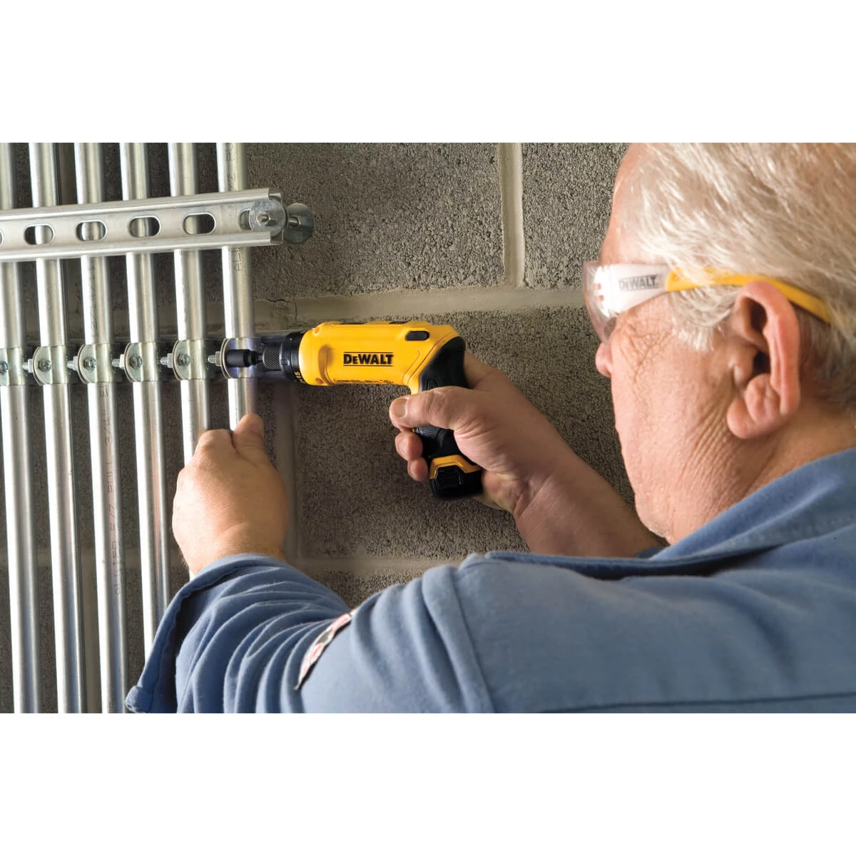 The DCF680N1 8V MAX* Gyroscopic Screwdriver 1 Battery Kit is ideal for achieving precision, speed, and control. Adjustable two-position handle allows for operation in either in-line or pistol-grip to suit the professional’s needs.